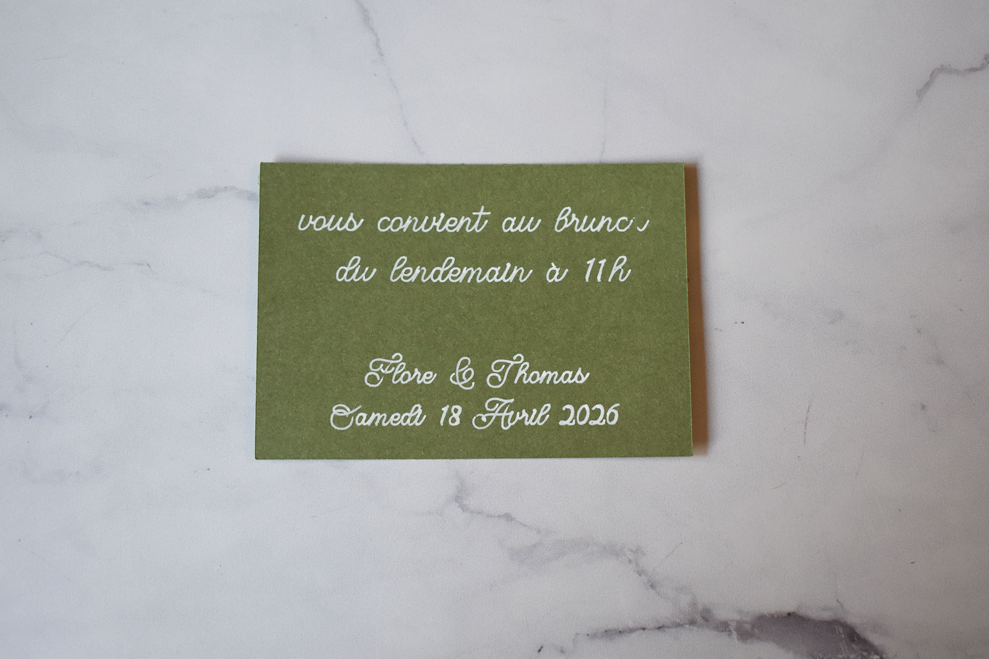 Avec son papier vert sauge et ses impressions blanches délicates, cette papeterie incarne la sobriété chic et la modernité, parfaite pour un mariage au style champêtre, bohème ou éco-responsable.
