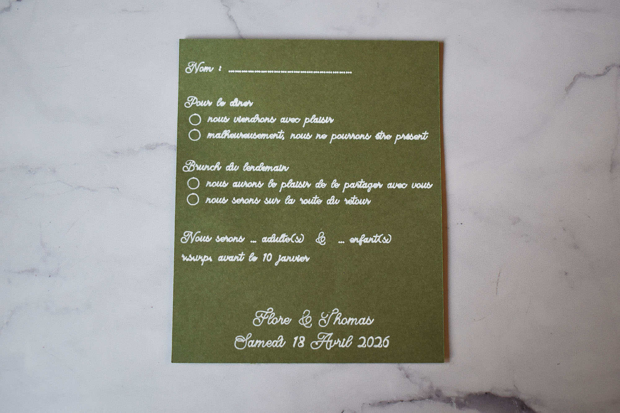 Avec son papier vert sauge et ses impressions blanches délicates, cette papeterie incarne la sobriété chic et la modernité, parfaite pour un mariage au style champêtre, bohème ou éco-responsable.