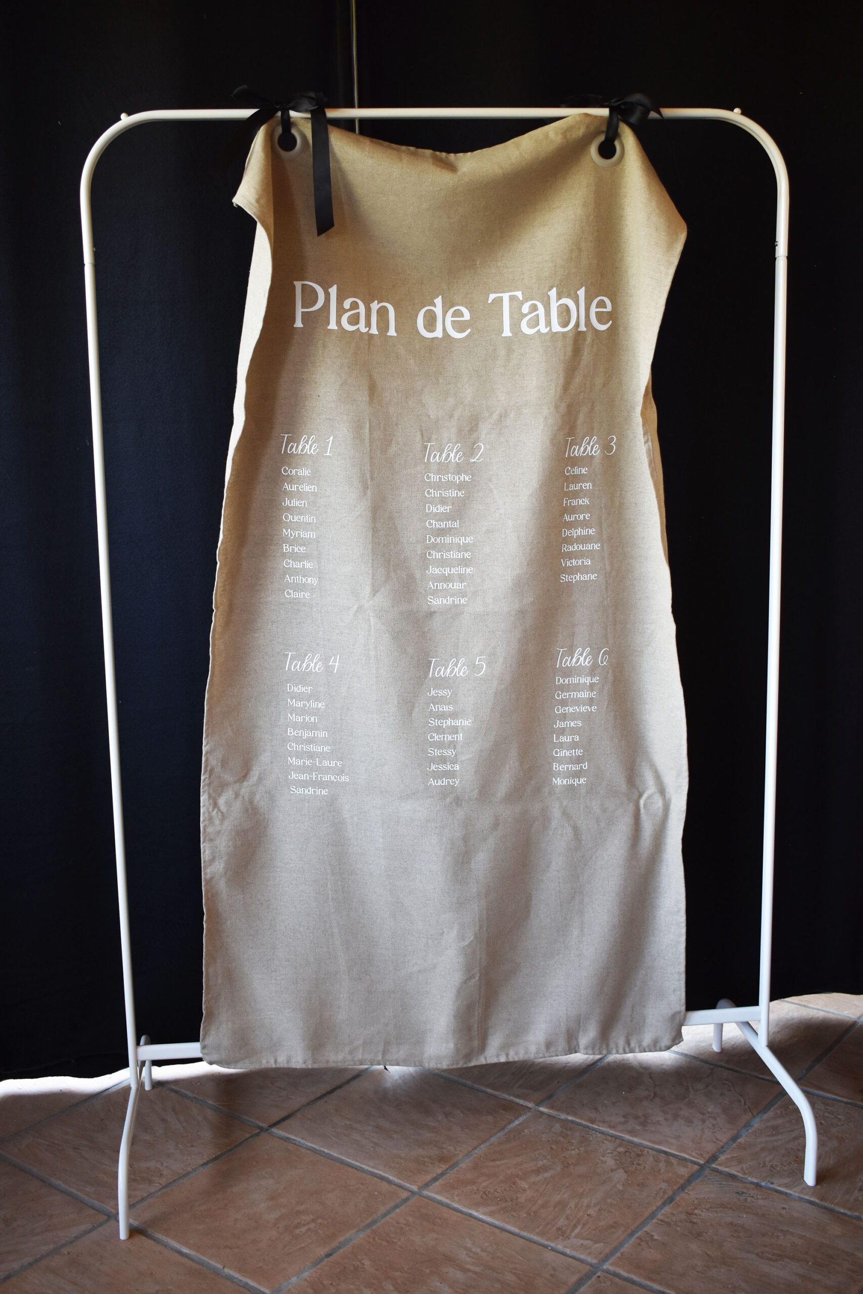 Accroché sur une arche, un support ou suspendu à l’entrée de votre salle, ce plan de table en tissu est à la fois pratique et décoratif.