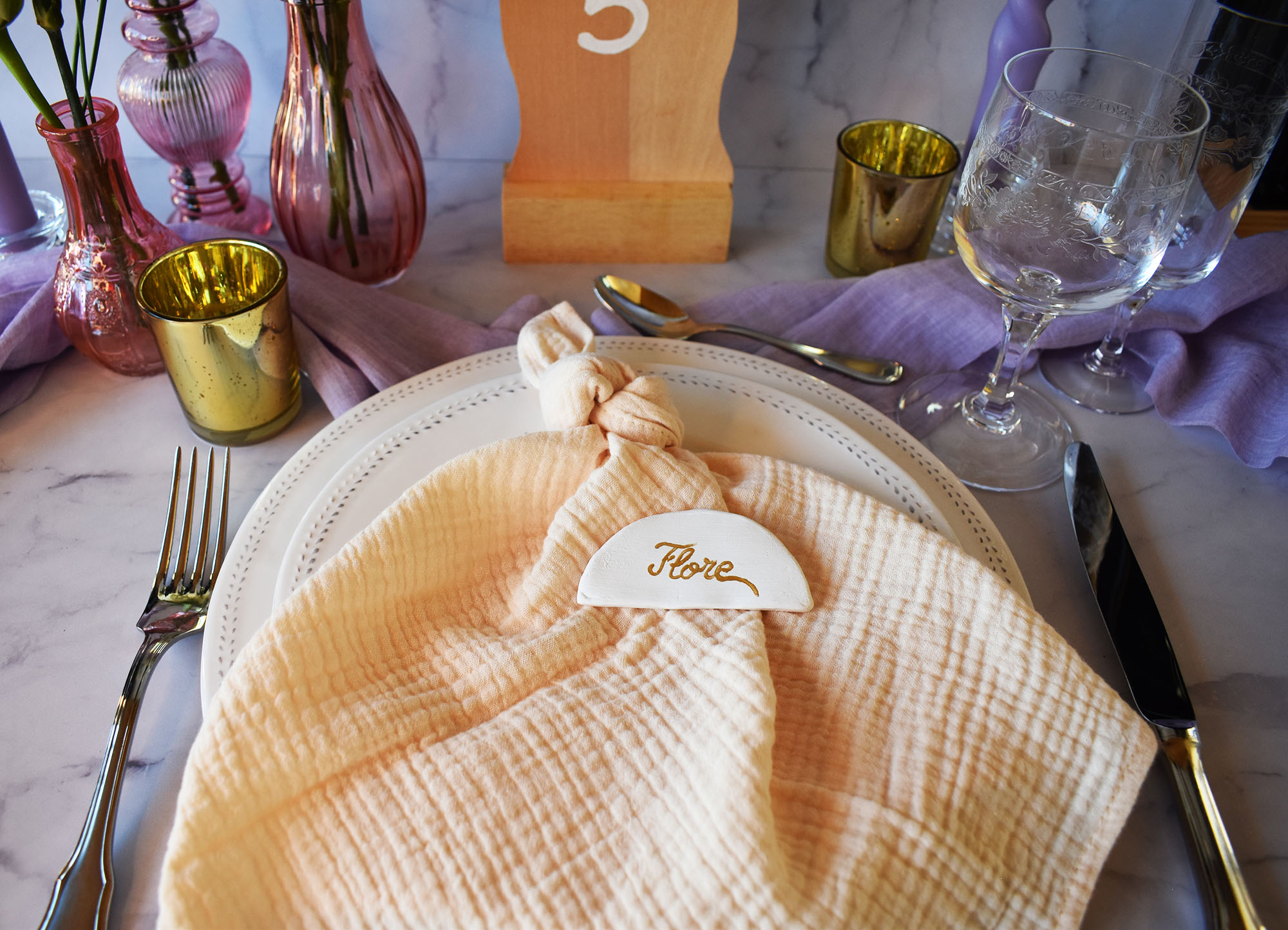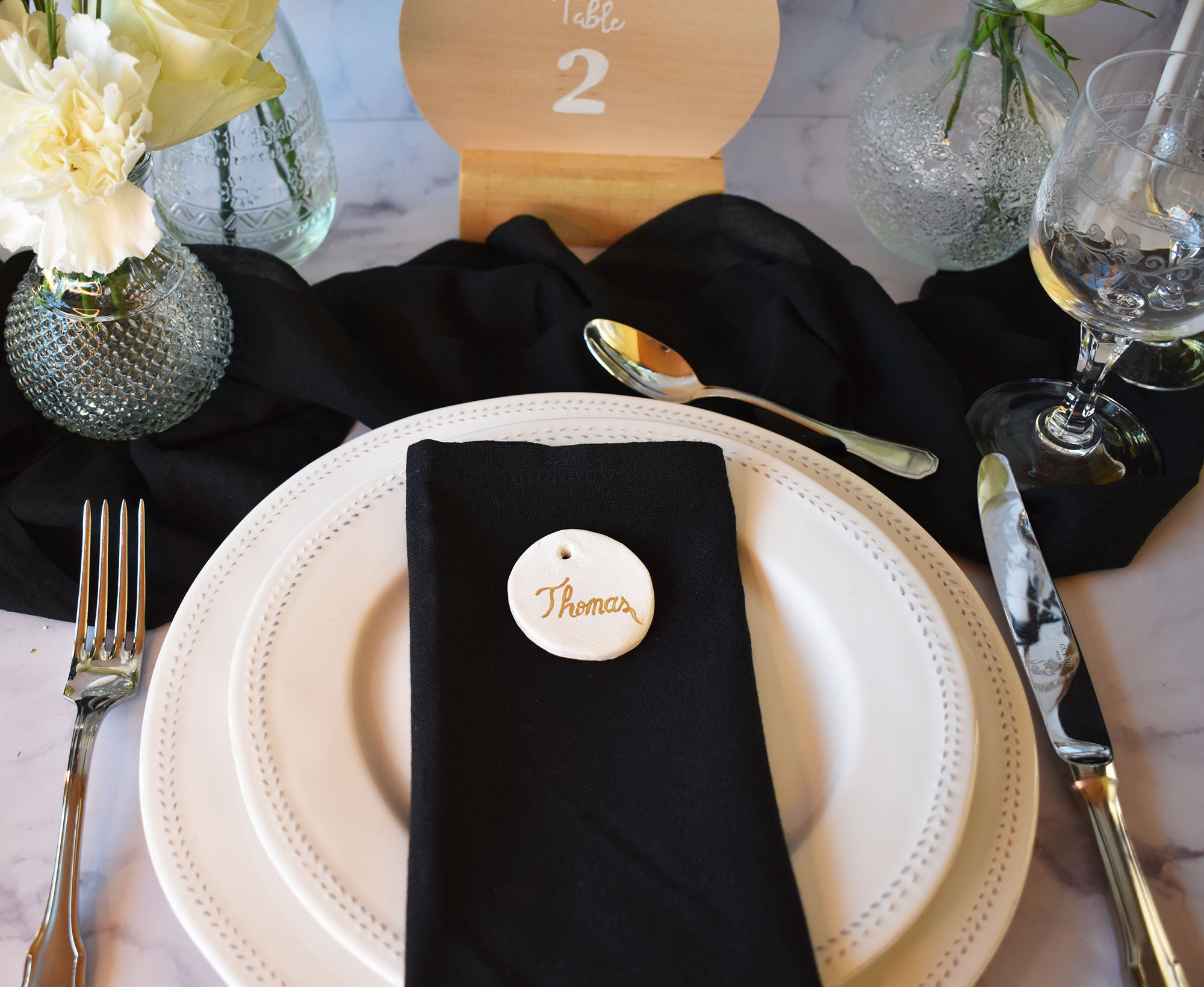 These clay wedding place cards combine modern design with artisanal authenticity, making them the perfect detail for an elegant and stylish wedding table setting.
