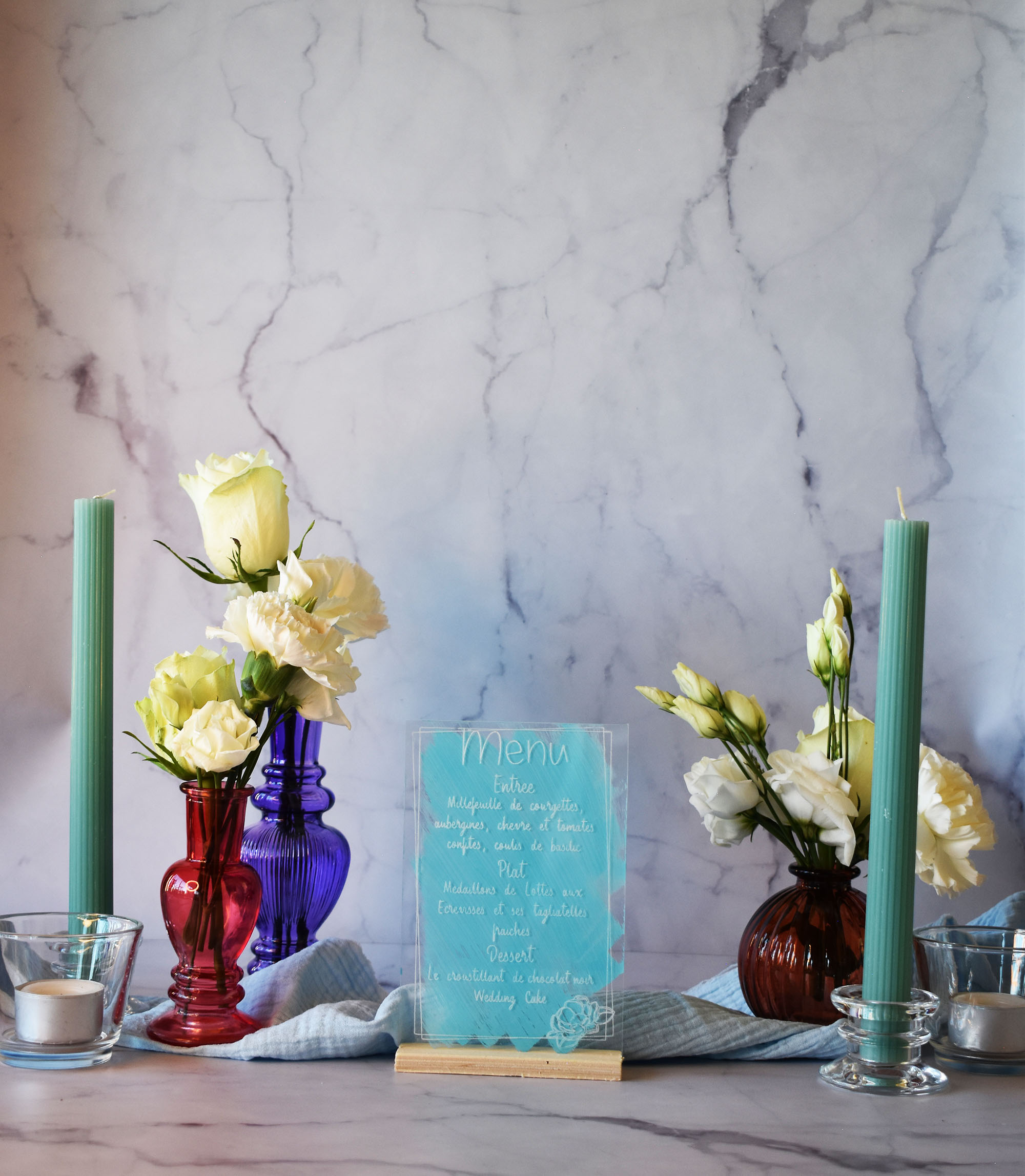 Enhance your reception tables with this engraved acrylic wedding menu 🌿✨. Its sleek and refined design showcases your dishes with elegant engraving directly on acrylic, while the hand-painted background adds an artistic and unique touch.